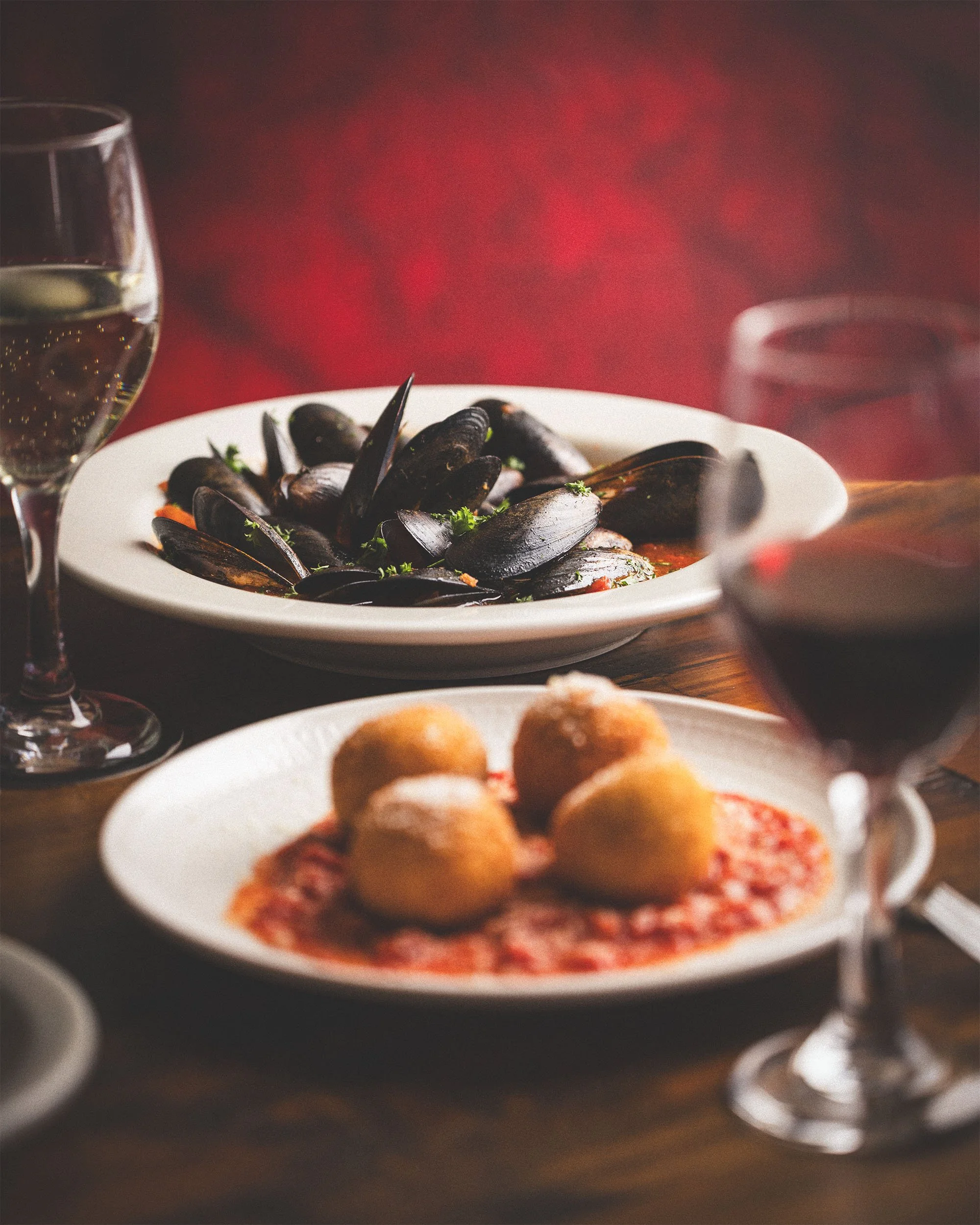 Plump Mussels steamed with Garlic, Herbs, and Chili Flakes. Choose Spicy House Red Sauce or Bright White Garlic-Wine Broth